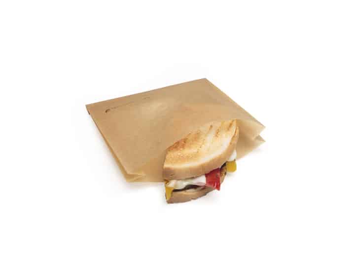Kraft paper hot bag for toasted sandwiches, pastries, pizza and more. This multi-tasking hotshot can handle temperatures up to 220°C allowing you to store pre-prepared food items in both hot cabinets and chillers alike - heat with a contact grill / grill press as and where required. Supports an altogether cleaner cooking environment and helps to reduce cross contamination from allergens (such as melted cheese).