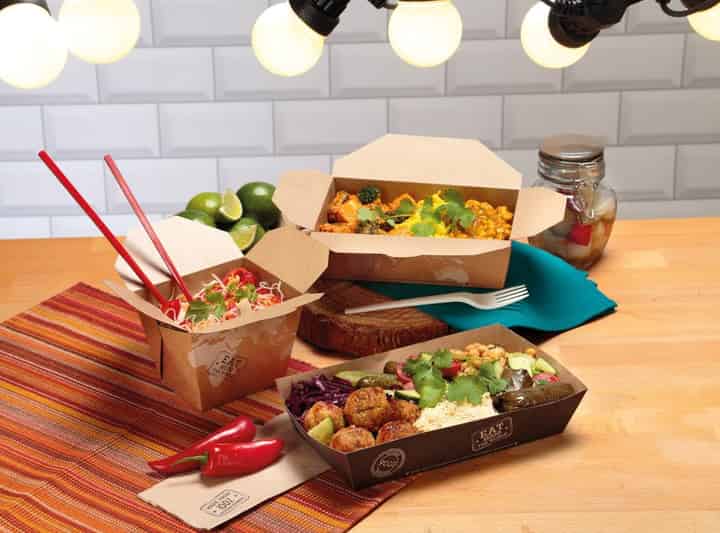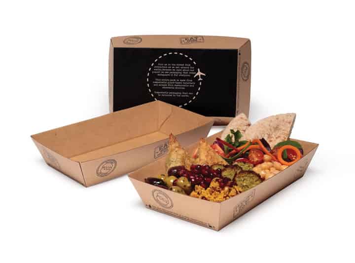 The Street Tray is the main event. Made from a corrugated kraft board, the tray is robust and certified home compostable while also protecting against leaks and seeps. Sporting our signature passport stamp print, the sturdy construction is suitable for a wide variety of street eats and festival-fare: from burgers and fries, to paella or pies and a whole lot in between. Consumers can take the tray out into the crowd or simply reheat at home.